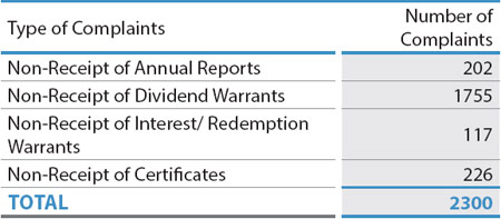 The number of complaints received and resolved to the satisfaction of investors during the year under review and their break-up are as under: