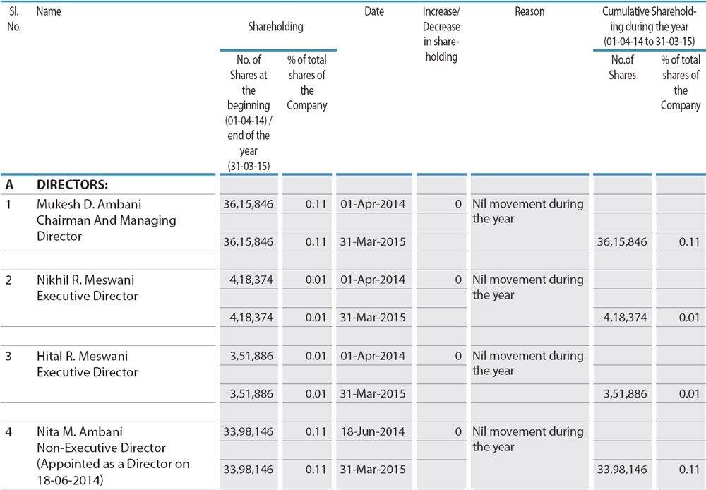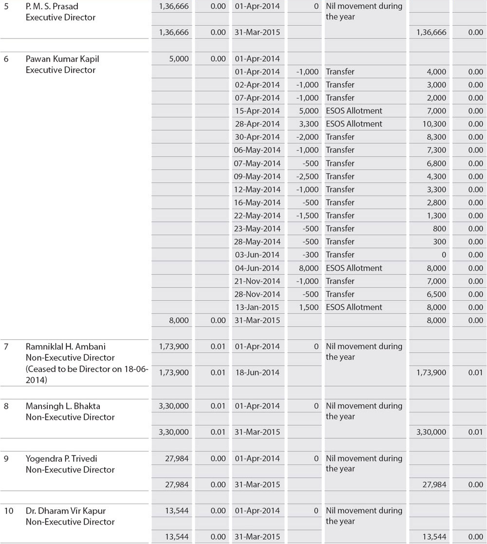In accordance with the provisions of the Act and the Articles of Association of the Company, Shri Hital R. Meswani and Shri P.M.S. Prasad, Directors of the Company, retire by rotation at the ensuing Annual General Meeting and being eligible have offered themselves for re-appointment. Shri Mahesh P. Modi, Independent Director of the Company passed away in February 2015. The Board places on record its deep appreciation for the valuable contribution made by him during his tenure as Director of the Company. Shri Maheswar Sahu, who was appointed as an additional director, demitted office as a Director effective March 30, 2015.