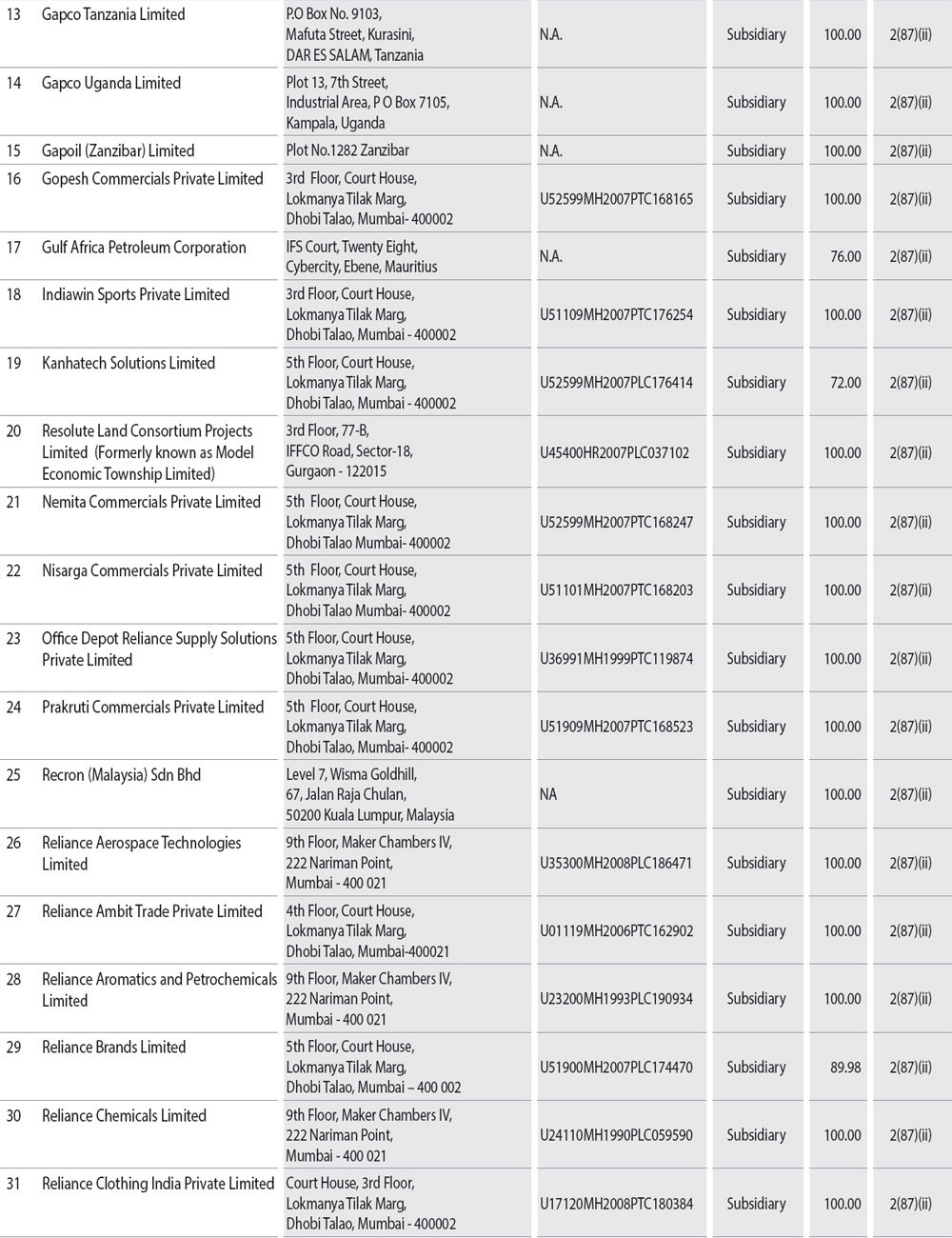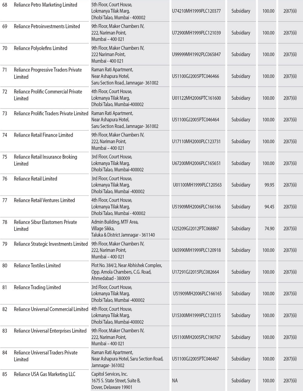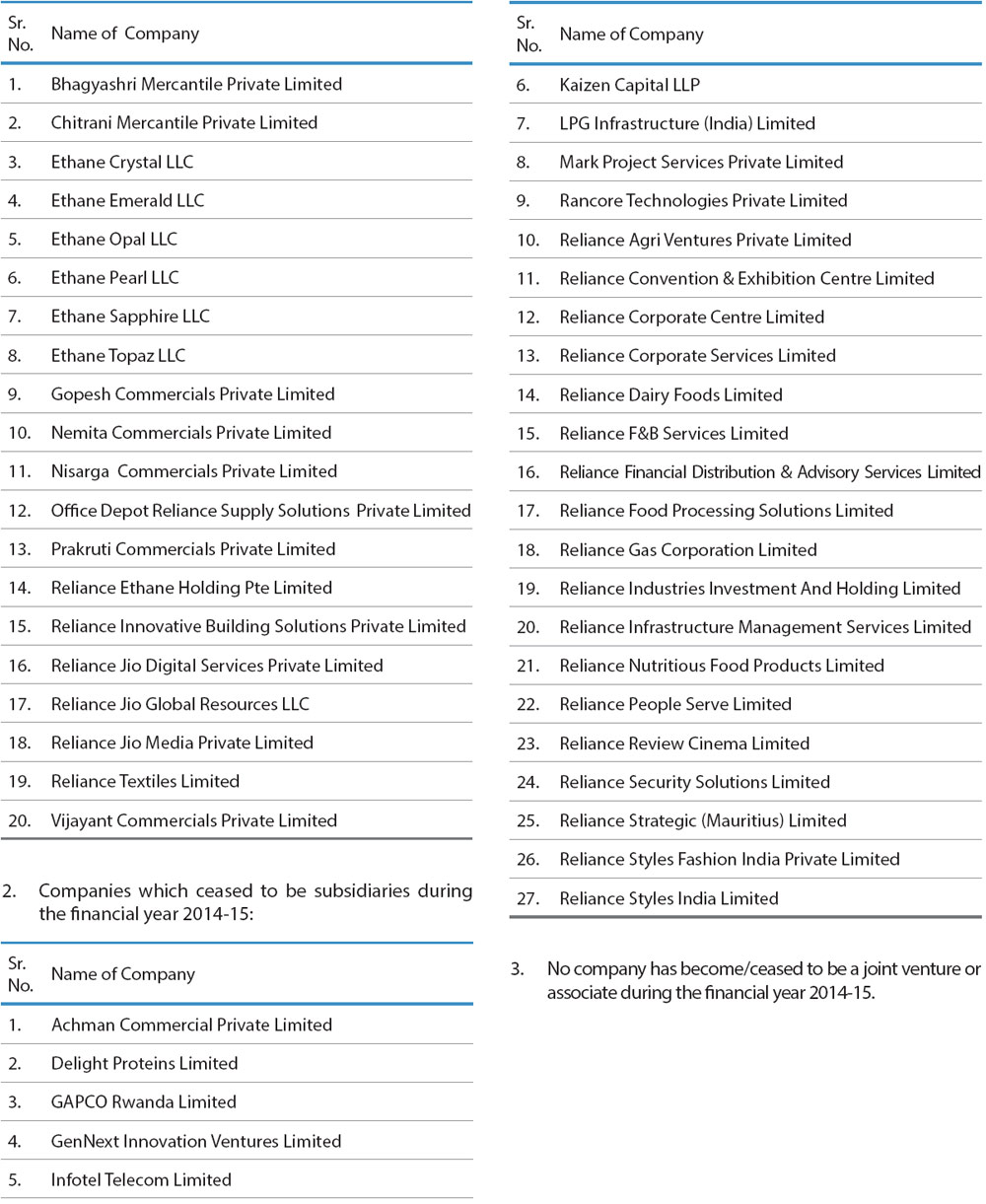 During the year under review, companies listed in Annexure I to this Report have become or ceased to be Company's subsidiaries, joint ventures or associate companies. A report on the performance and financial position of each of the subsidiaries, associates and joint venture companies as per the Companies Act, 2013 is provided as Annexure A to the consolidated financial statement and hence not repeated here for the sake of brevity. The Policy for determining material subsidiaries as approved may be accessed on the Company's website at the link: http://www.ril.com/getattachment/759df65c-9a8d-42ff-a23c-e1c5d892e0c7/Policy-for-determining-Material-Subsidiaries.aspx
