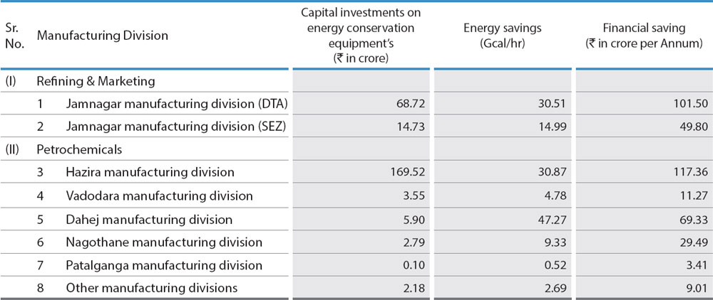 Energy conservation dictates how efficiently a company can conduct its operations. RIL has recognized the importance of energy conservation in decreasing the deleterious effects of global warming and climate change. The Company has undertaken various energy efficient practices that have reduced the growth in carbon di-oxide (CO2) emissions and strengthened the Company's commitment towards becoming an environment friendly organisation.