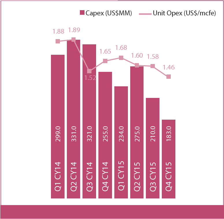 The overall macro environment remained challenging for the shale gas business in CY 2015. Weak global demand (especially from China) and increased global supplies from both non-OPEC and OPEC producers impacted realisations adversely putting pressure on commodity prices. In response, Reliance reduced activity levels across all Joint Venture (JVs) and targeted drilling on sweet spots. Zero drilling strategy continued for Carrizo JV. At Chevron JV by end of Q4 CY 2015, all rig operations were stopped and Pioneer JV had only five rigs operational by the end of the year (all released during Q1 CY 2016). During CY 2015, gross JV production averaged at ~1.26 Billion of Cubic Feet Equivalent (Bcfe)/day, reflecting growth of 7% y-o-y. Reliance Holding USA Inc., which mainly comprises the shale business, delivered Earnings Before Interest and Tax (EBIT) of ₹316 crore in CY 2015 compared to ₹1,949 crore in CY 2014. Operational trends remained strong though drilling and completion activities were slowed down and continuous focus was maintained on growing asset value through reduction in well cost and operating expenditures.