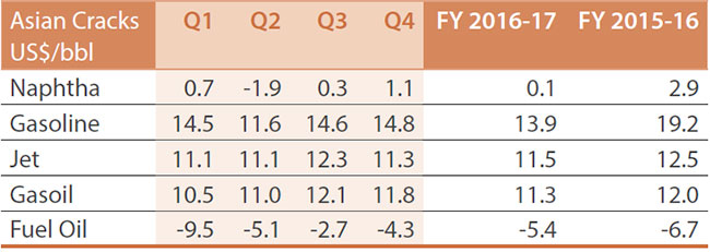 Light distillate cracks receded from the record high reached in FY 2015-16. Gasoline demand contributed around 40% of global oil demand growth, with the US, China and India contributing 60% to the global gasoline demand growth.