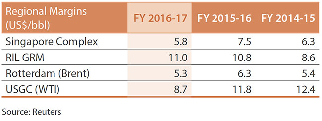 Strong refining margins in early CY 2015 enticed refiners globally to run at a higher utilisation as well as maximise gasoline production in early 2016 too. Global refinery utilisation at 83.5% in 2016 was flat y-o-y albeit higher than the 5 year average of 82.6%. This sustained utilisation driven supplies with relatively lower demand growth and inventory build-up during the year moderated refining margins from exceptional highs in the previous year.