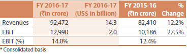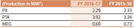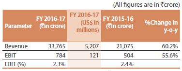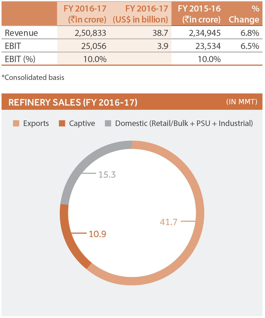 The petrochemical business posted record earnings with 5 year high EBIT margin of 14%. The segment EBIT stood at `12,990 crore in FY 2016-17, up by 27.5% y-o-y.