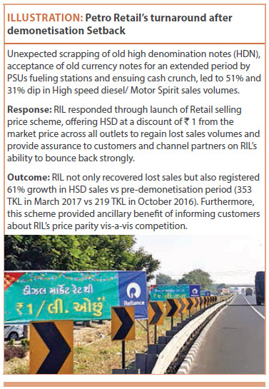 RIL continued to build-out its domestic retail network with 1,221 fuel outlets operational as at the end of FY 2016-17. RIL’s fuel outlets registered significant volume growth with yearend exit throughput more than double the industry average, highlighting the superior customer experience and value added offerings.