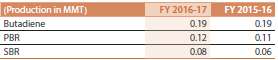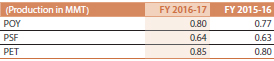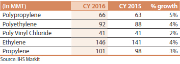 During FY 2016-17, India's oil demand grew 5.2% led by strong consumption demand growth in gasoline (+8.8%) and jet kerosene (+12.1%). This was underpinned by 9.2% growth in passenger vehicle sales, 6.9% growth in two-wheelers sales and 21.7% growth in domestic airline passenger traffic. Domestic diesel demand remained muted at 1.8% as the industrial cycle lagged consumption. Polymer demand grew by 7% and polyester demand grew by 3% during FY 2016-17.