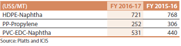 Brent crude oil prices averaged US$48.6/bbl in FY 2016-17, marginally higher than US$47.5/bbl in FY 2015-16. Oil prices rose in H1 CY 2016 on lower production due to Canadian wildfires and disruptions in Nigeria. The production cut by OPEC and some non-OPEC members in Q1 CY 2017 had little impact on OECD crude and product inventories. These higher inventory levels and also additional supplies have capped the upside on crude oil prices. Further, the higher production outlook for US shale oil has been acting to undermine efforts to tighten the crude markets.