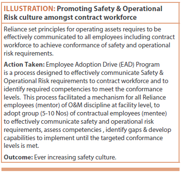 Mitigation: The Reliance HSE policy requires that ‘Safety of persons overrides all production targets’. This ensures that all employees strive for excellence in their own personal safety and the safety of others including employees, contractors, customers and the communities within which Reliance operates. Reliance has set itself the goal of ‘zero injuries and incidents‘. A separate Safety and Operational Risk (S&OR) function provides oversight on HSE exposures and periodically conducts HSE assessments and reviews to get assurance on the operation of the HSE management framework protocols and regulatory compliances.