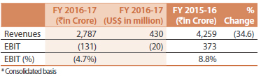 In the Media business, Network18 Media and Investments reported consolidated revenue and negative EBIT of `1,491 crore and (`201) crore, respectively, for FY 2016-17 as it continued to invest in launch of new channels and digital businesses, while upgrading existing properties and talent.