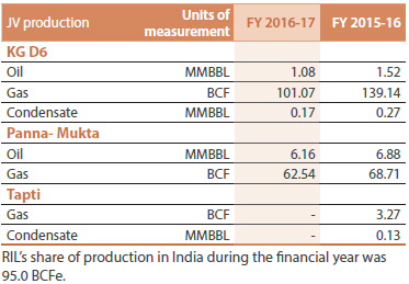 Operationally, FY 2016-17 continued to witness lower upstream production and weak domestic gas price realisations. The domestic oil and gas production (RIL share) was down 23% to 95 billion cubic feet equivalent. The unfavourable upstream price environment and declining volumes resulted in negative segment EBIT for the year at (`131) crore.
