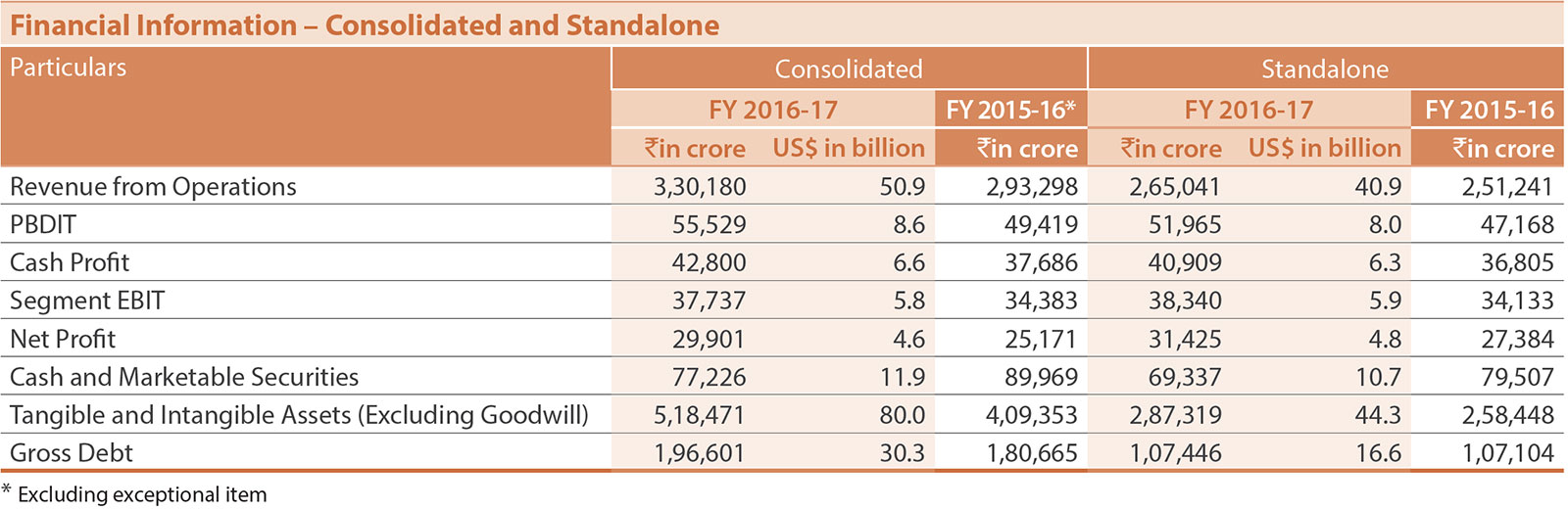 RIL’s standalone revenue from operations for FY 2016-17 was `2,65,041 crore (US$40.9 billion) an increase of 5.5% on y-o-y basis. Standalone profit after tax was at `31,425 crore (US$4.9 billion) an increase of 14.8 % against `27,384 crore in the previous year. Basic EPS on standalone basis for the year was `96.9 as against `84.6 in the previous year.