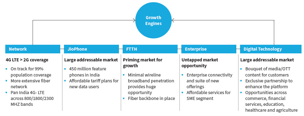 Jio is aiming to provide global standard wireline infrastructure and services in India through its FTTH and Enterprise offerings. To accelerate this rollout, RIL has made strategic investments in Hathway Cable and Datacom Limited and DEN Networks Limited.