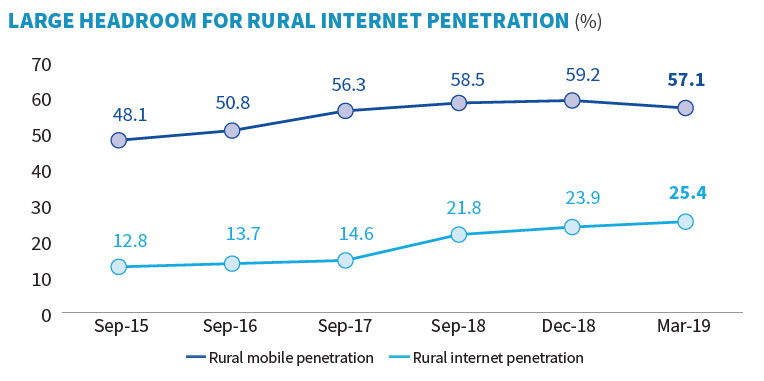 India continues to embrace the digital life. Reliance Jio has propelled India to become the largest mobile data consuming economy in the world. With ubiquitous and reliable data services, data networks are increasingly being used for media and entertainment, education, market information and for transactions among other use-cases. Adoption of digital transactions witnessed exponential growth. UPI payments grew from 0.7% of GDP in FY 2017-18 to 4.7% in FY 2018-19, while credit card growth averaged a strong 32% y-o-y in FY 2018-19.
