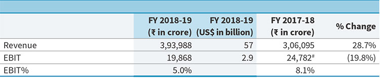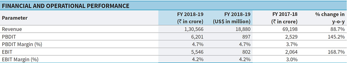 For FY 2018-19, India’s oil demand grew at about 3% y-o-y with consumption-led demand growth in gasoline (+8.1%), gasoil (+3.0%) and jet fuel (+9.1%). The demand was driven by robust growth in commercial vehicle sales and strong air traffic growth during the year. On the rural side, tractor sales and three-wheeler sales declined from the highs of FY 2017-18, but continued to grow in double digits. Domestic demand growth for petrochemical products was healthy with both polymer and polyester demand growing at 7.0% y-o-y.