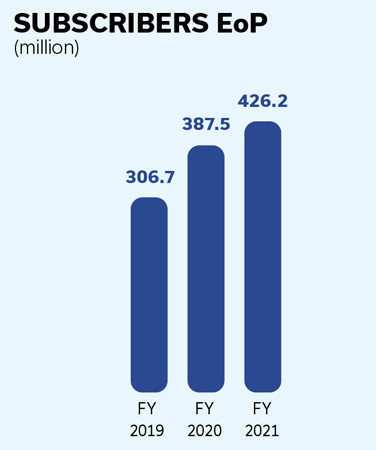 Jio became the first operator outside China to cross the 400 million subscriber milestone in a single country market; the subscriber base at the end of FY 2020-21 was 426 million