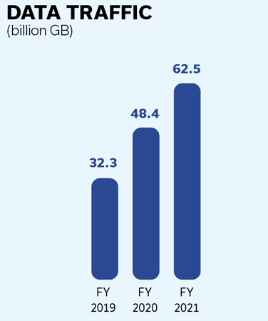 Improving broadband network penetration, device and services affordability, and new use cases for digital have caused a 33% increase in data usage across the country over CY 2020 (99 exabytes of data usage in India during 2020). Mobile data usage in India is expected to quadruple to over 35 exabytes per month by 2026 with 1.2 billion smartphone users (Ericsson Mobility Report 2020) Jio, with its affordable data plans, has been the primary driver of data boom in India over the past three years.