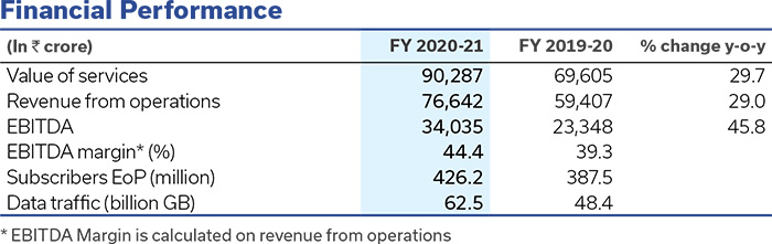 Digital Services reported another year of strong revenue and EBITDA growth in FY 2020-21 on the back of continued increase of wireless subscribers and modest growth in wireline services subscriptions. Customer engagement on the Jio network remained healthy across data and voice services, with video accounting for 70% of data usage. Jio led subscriber growth in the country with gross addition of 99 million. Gross revenue of `90,287 crore on a yearend subscriber base of 426 million and EBITDA margin of 44.4% attest to the execution capability of the Digital Services team