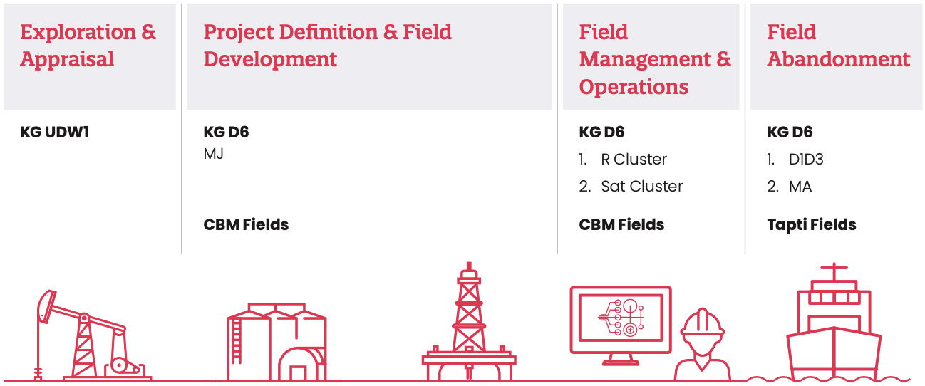 The Company is leveraging its existing infrastructure in the KG Basin to develop three projects in Block KG D6 and is undertaking exploration in contiguous areas. Two of the fields, R Cluster and Satellite Cluster, have been commissioned and production is being ramped up
